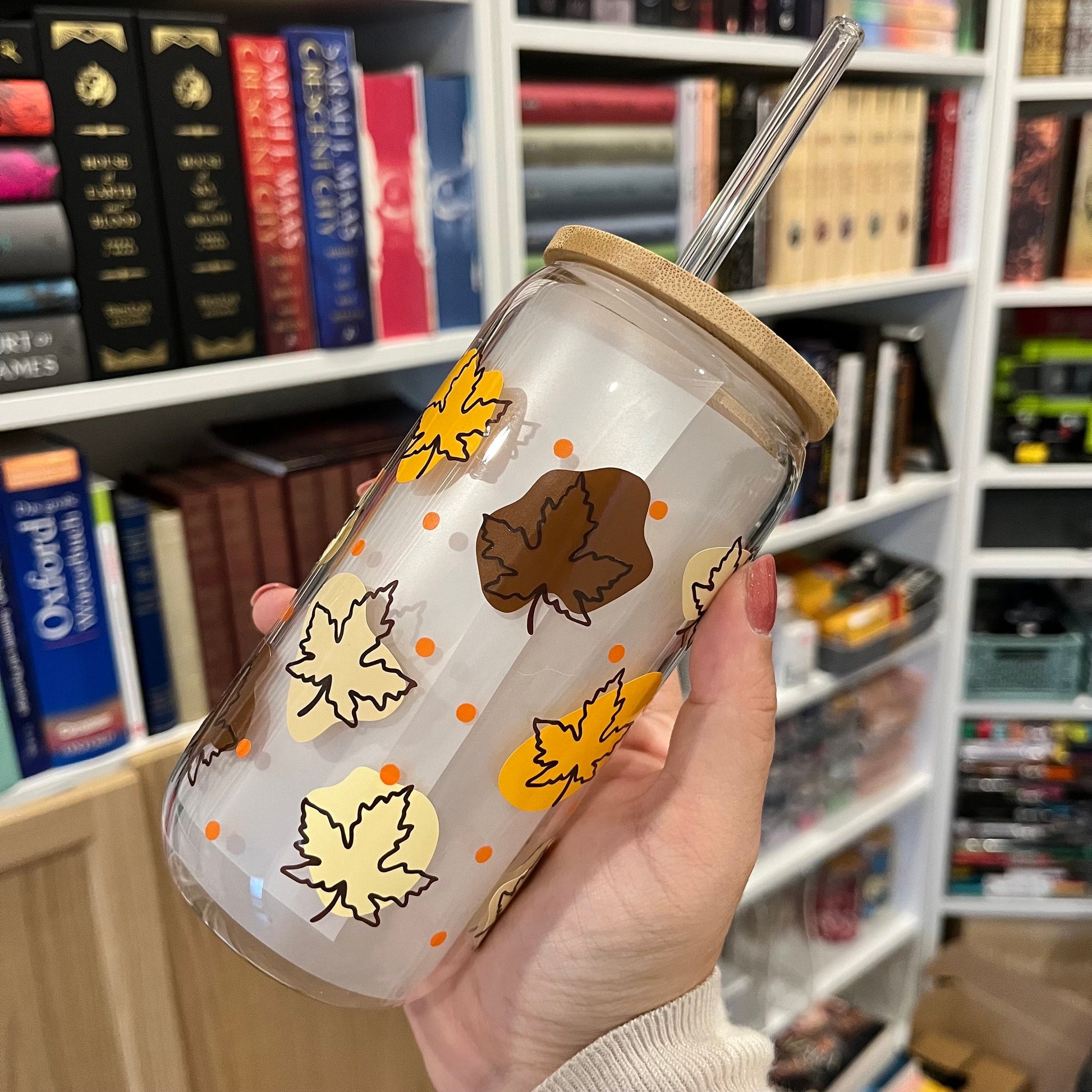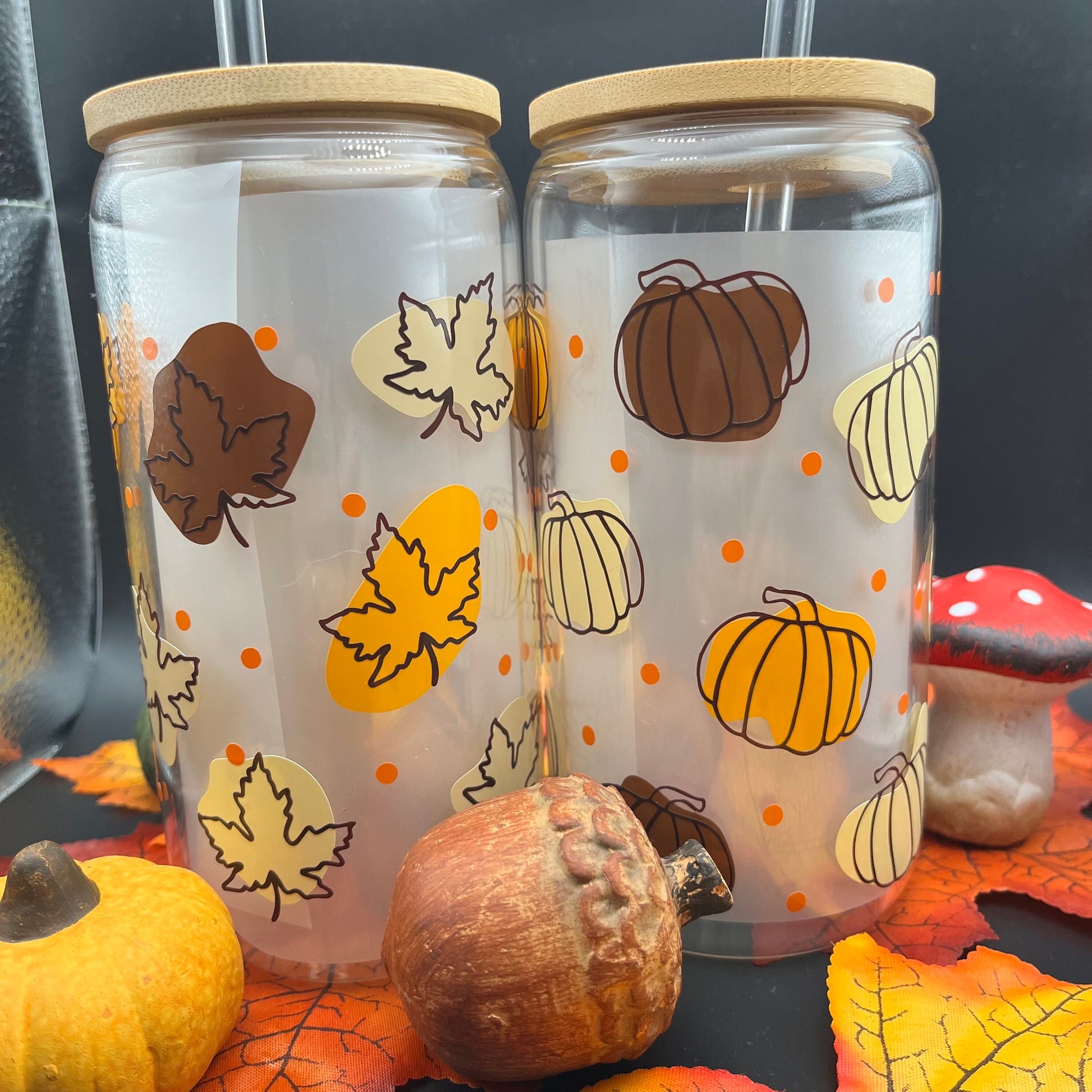 Autumn Glass Tumbler | Herbstliches Trinkglas | Glas mit Bambusdeckel und Strohhalm