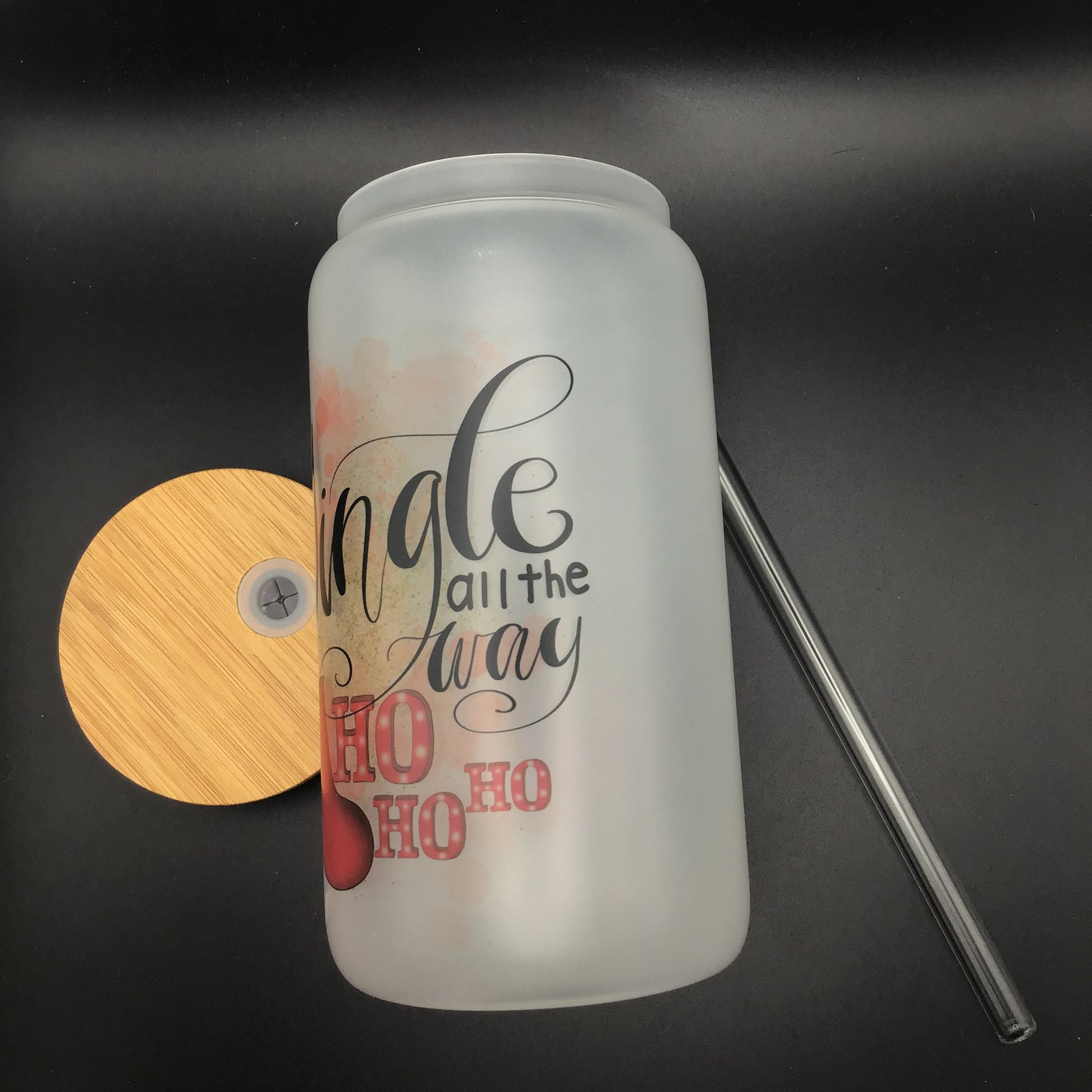 Jingle all the way Frosted Glass Tumbler | weihnachtliches Trinkgefäß | Glas mit Bambusdeckel und Strohhalm